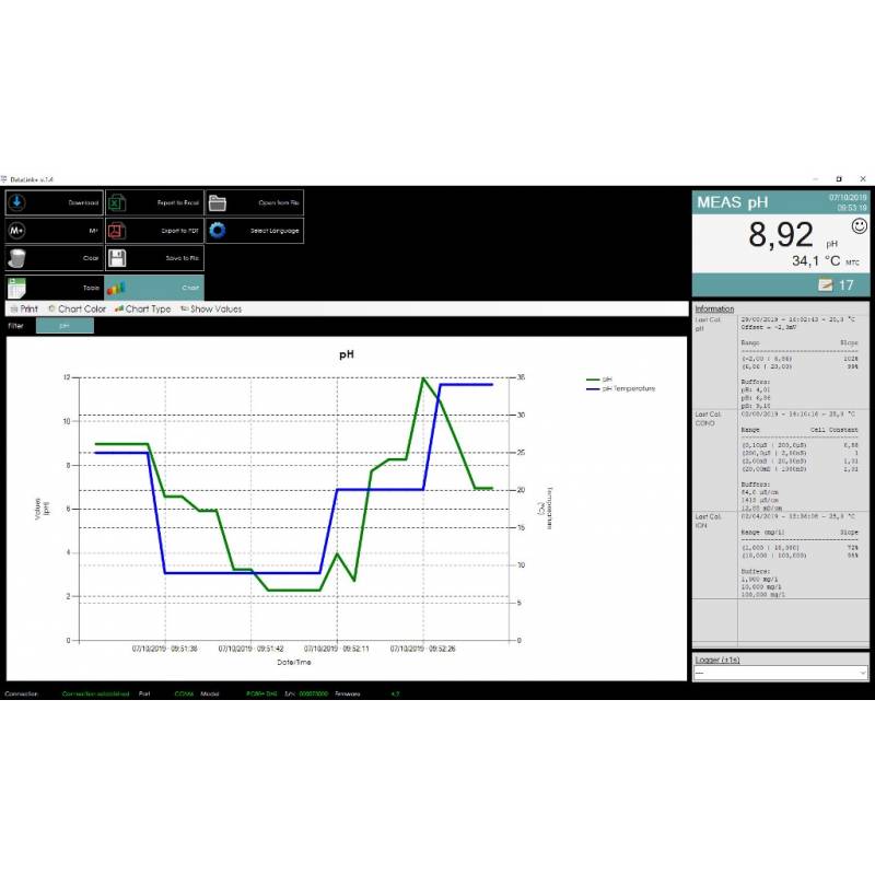 Display grafico a colori 3,5”; Visualizzazione multipla fino a 6 parametri; GLP con password e scadenza di calibrazione; Memoria interna 10.000 dati in GLP; Soglie di allarme pH; Modalità titolazione; Compensazione per acque ultrapure; Fermo-lettura; Autospegnimento; Modalità schermo intero; Connessioni BNC - RCA; Software gratuito DataLink+; Micro USB; Sensori con 3 metri di cavo; costante di cella selezionabile (0,1 - 1 - 10); Compensazione automatica temperatura; Compensazione automatica pressione atmosferica e salinità (DO).