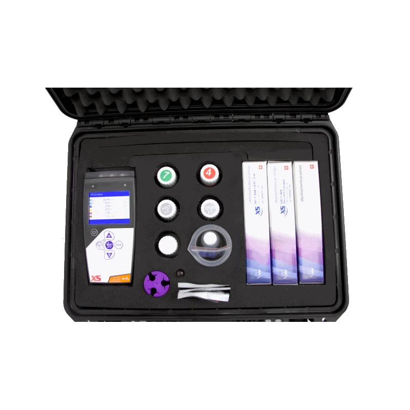 FORNITO con : Supporto da campo per elettrodi a 3 posizioni, soluzioni tampone di pH, Cond e Oxy, cavo USB, alimentatore, manuale multilingua a colori, valigia IP67, batterie e report di collaudo.
