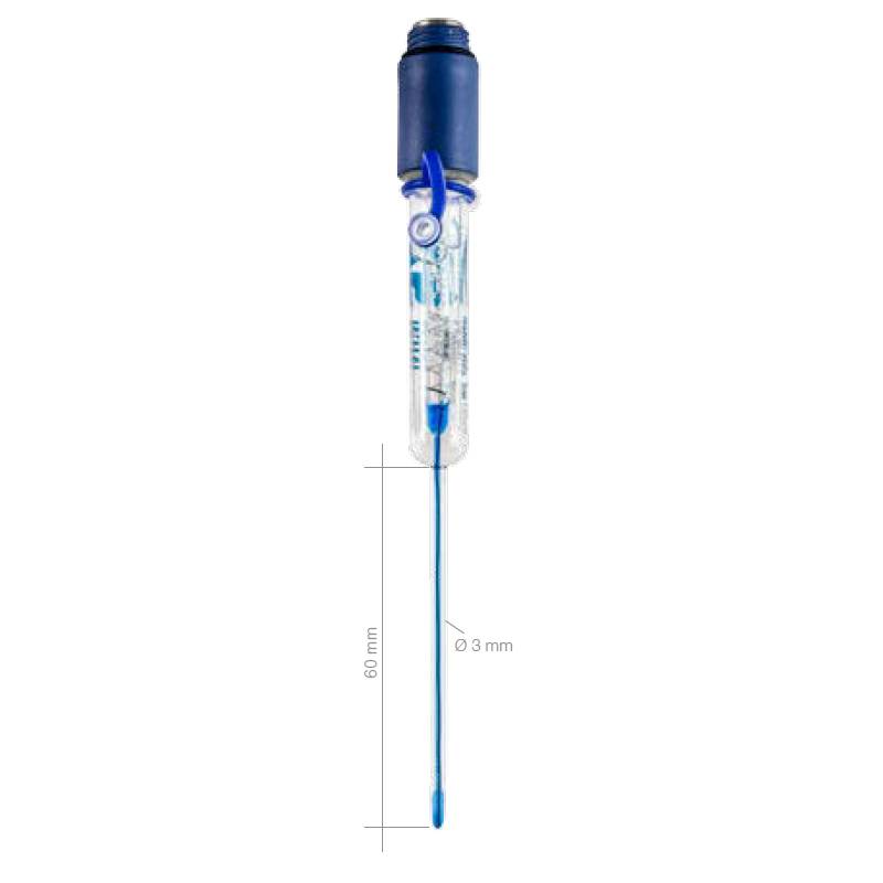 Elettrodo di pH combinato, testa a vite S7. Corpo in vetro "micro 3”. Dimensioni (LxØ) mm 60x3. Elettrolita KCl 3M. Per piccoli volumi di campioni <2 ml.